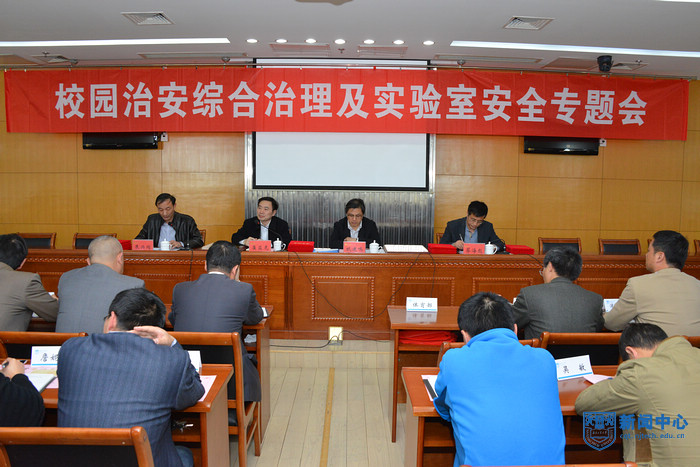 4月2日下午,学校在逸夫图书馆五楼会议室召开了2014年度校园治安综合治理及实验室安全专题会。副校长崔益虎,副校长巩建鸣,校综治委全体成员,2013年度综合治理先进个人及相关人员出席了本次会议。会议由保卫处处长朱兴同主持。